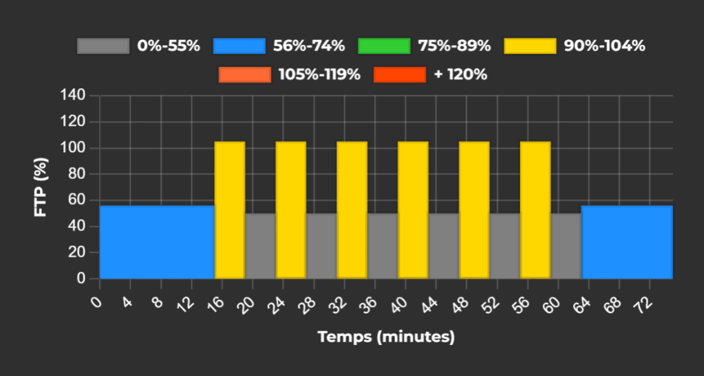 - Récupération active : 4 minutes à 50% du FTP entre chaque série. Pendant la récupération, l’objectif est de maintenir une cadence fluide à faible intensité pour permettre aux muscles de se débarrasser du lactate accumulé.