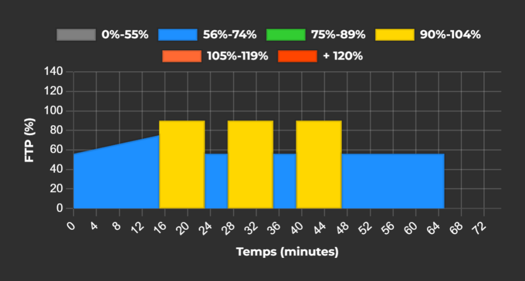– 3 x 8 minutes à 85-90% de votre puissance au seuil, avec 4 minutes de récupération entre chaque. Ces intervalles doivent être effectués à une intensité qui vous permet de rester concentré sur votre technique tout en sollicitant votre endurance.
