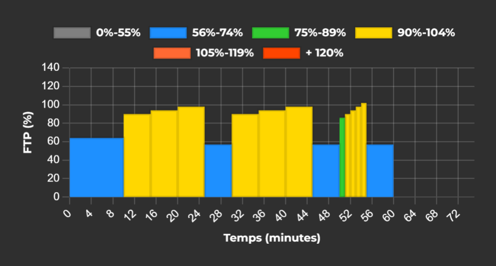 - Fréquence : Une fois par semaine est suffisant pour ce type de séance, car elle est relativement exigeante. Pour les cyclistes plus expérimentés, il est possible d’ajouter une deuxième séance d’intervalles plus courte, à condition de bien gérer la récupération.