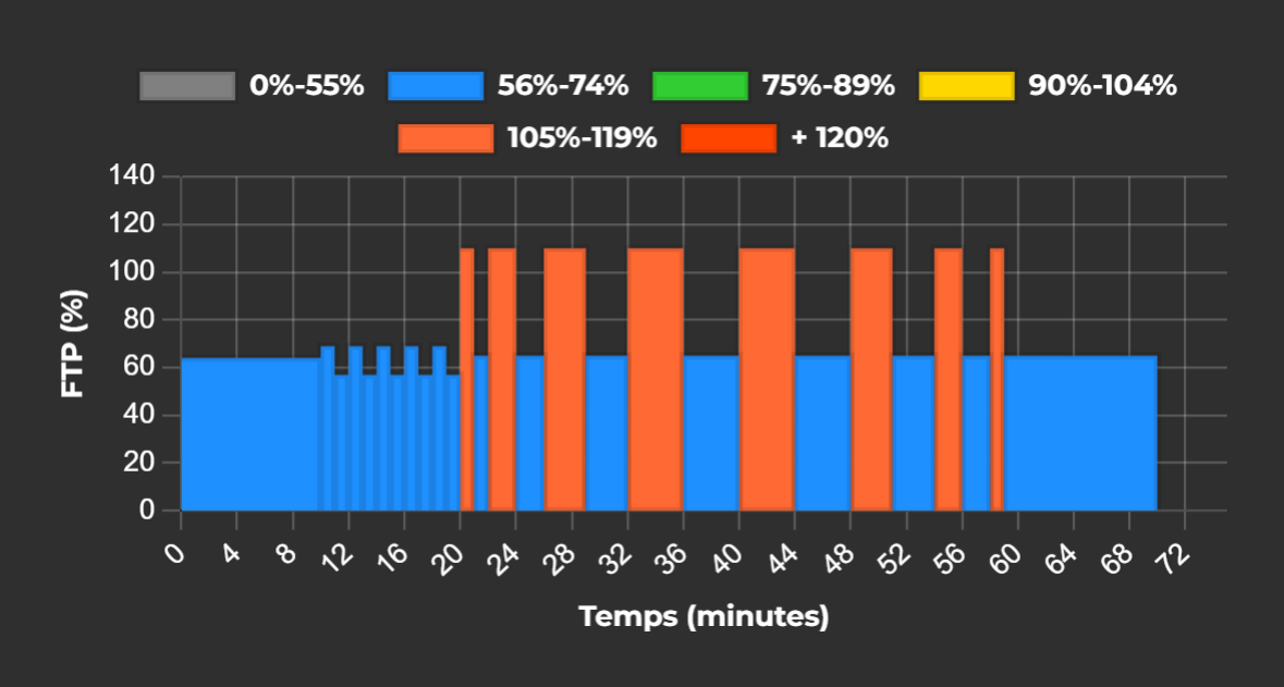 - 1 minute à 110% FTP (ou 92% FCmax), suivie de 1 minute de récupération douce.