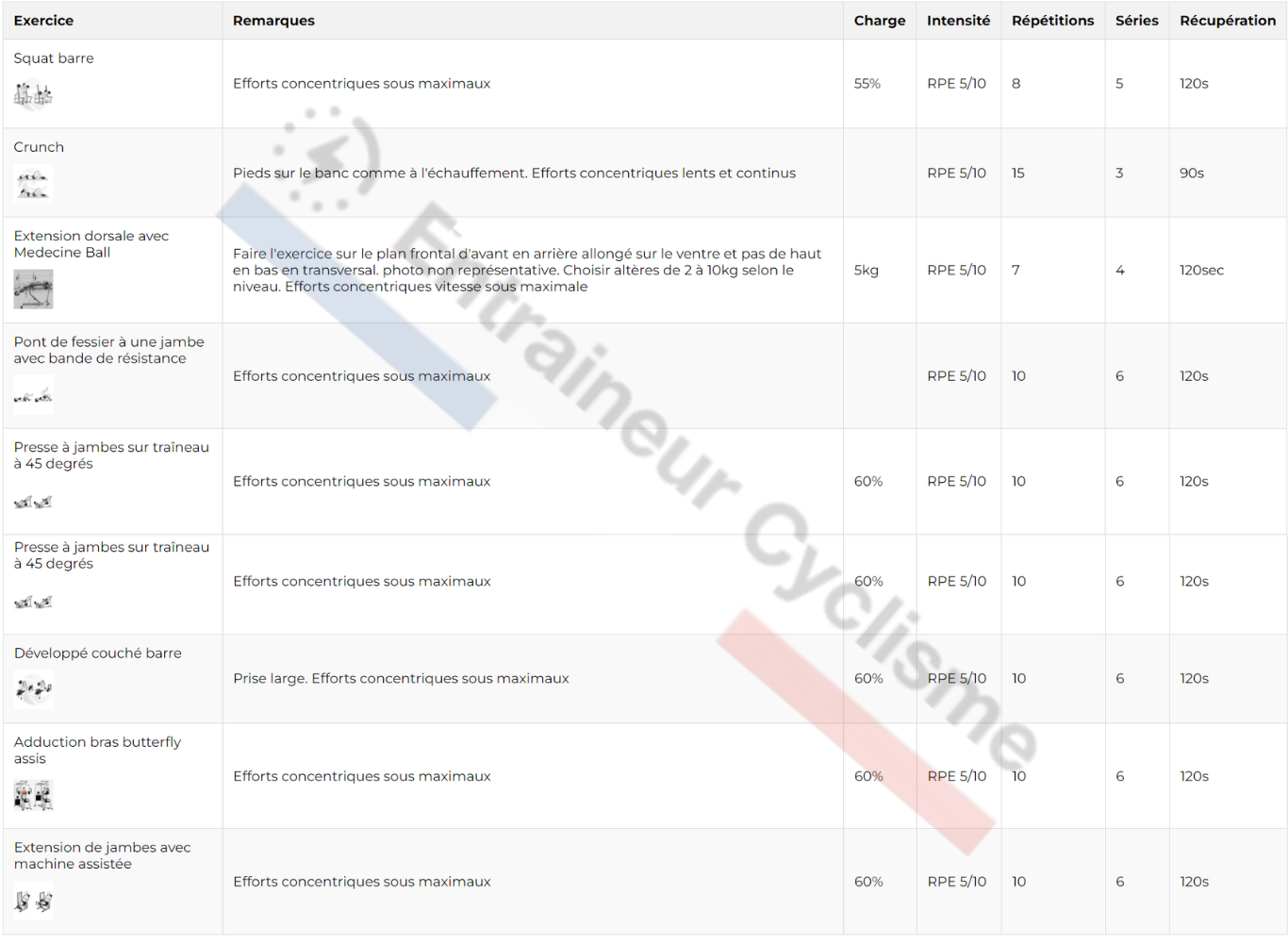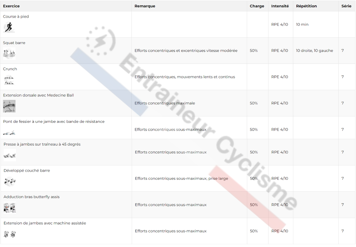 Ces trois semaines d’exercices répétés constituent une phase d’accumulation, où le volume et la charge de travail sont stables, permettant au corps de construire une base solide de force et d’endurance. Une fois cette phase terminée, vous pouvez passer à un cycle plus intensif ou varié, avec de nouvelles bases renforcées.